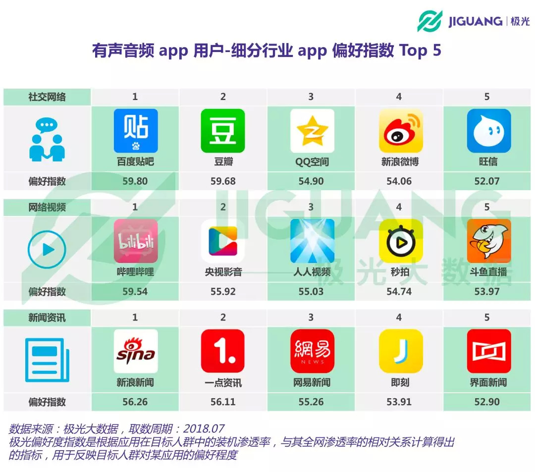 在社交网络app上,有声音频app用户最偏好百度贴吧、豆瓣和QQ空间。在网络视频app上,哔哩哔哩、央视影音和人人视频最受有声音频app用户偏爱。而在新闻资讯app上,有声音频app用户最偏爱新浪新闻、一点资讯和网易新闻。