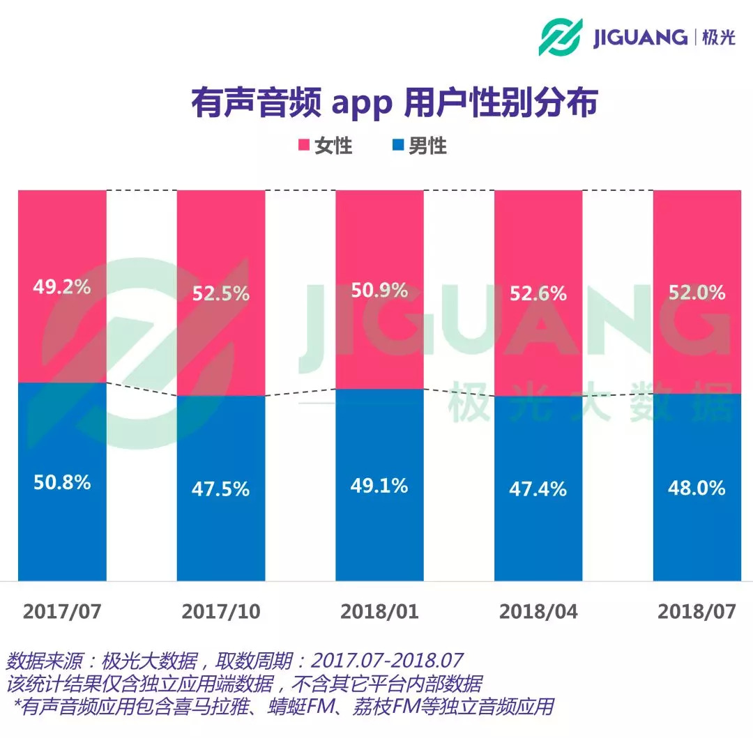根据极光大数据的统计结果,尽管过去一年女性用户的占比有所上升,但有声音频app的用户性别构成整体仍维持在相对均衡的水平。截至今年7月份,有声音频app的女性用户占比为52%,男性用户占比为48%。