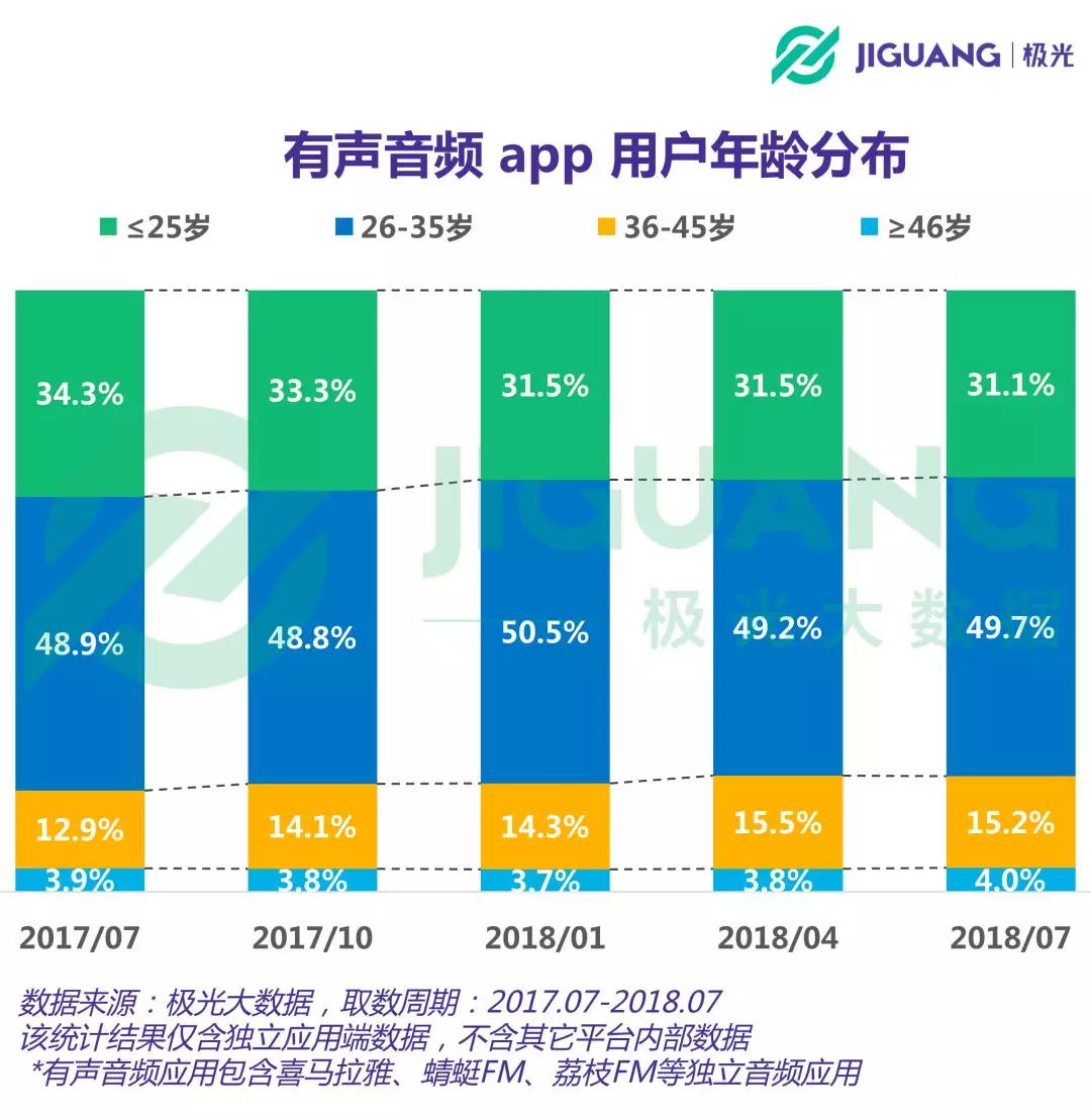 用户年龄分布结果显示,有声音频app用户集中度最高的年龄段是26-35岁,有49.7%的用户处于该年龄段。其次为25岁及以下用户,占比为31.3%。与去年同期相比,25岁及以下用户在有声音频app中的占比下降了3.2%。