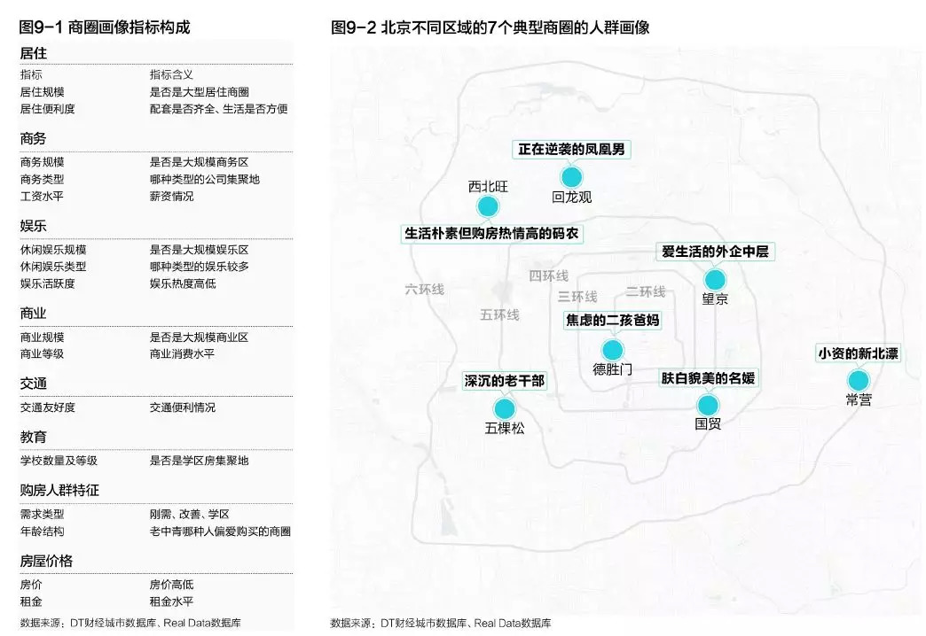 我们将第一财经旗下DT财经城市数据库的BLECTS指标体系数据与贝壳研究院Real Data数据产品中的楼盘数据、房产交易数据和购房行为数据打通,形成8类、17个最具代表性的评析维度(如图9-1),重点选择分布在北京不同区域的7个典型商圈(西北旺、望京、常营、回龙观、五棵松、德胜门、国贸),通过人群画像,试图形成更加形象生动的商圈图鉴(如图9-2)。