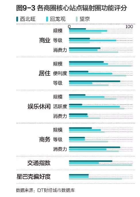 16号线上的西北旺站辐射圈内多个指标明显滞后,商业等级和商业规模排在7个商圈中最末,休闲娱乐规模、休闲娱乐活跃度也位列7个商圈中的后半段(如图9-3),反映了西北旺程序员朴素的日常生活。“上海互联网发展赶不上北京,是因为灯红酒绿动摇了敲代码的决心”的说法不无道理。
