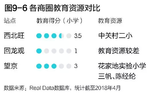 不过,生活不便与无心消费背后,却是西北旺人较高的购房热情。西北旺站的房子和程序员一样,看似朴实无华却暗藏玄机。楼龄15岁、没电梯的回迁房春夏秋冬四姐妹(春晖园、夏霖园、秋露园、冬晴园),对口中关村二小百旺校区(如图9-6),虽然位于西北五环外,但房价已经接近8万/㎡(如图9-5),在7个商圈中仅次于位于北二环的德胜门。