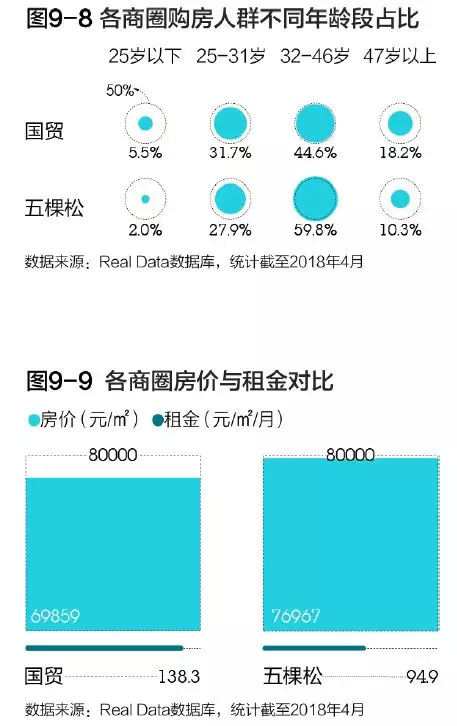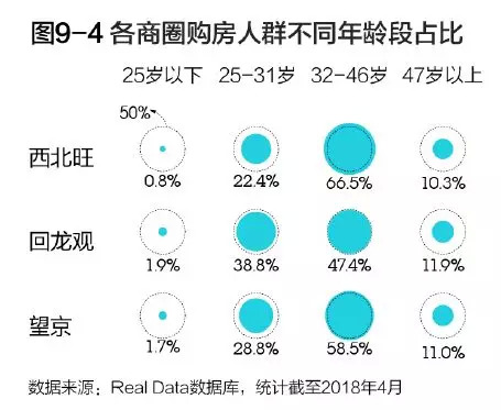 Real Data数据显示,回龙观站购房人口最为年轻,25-31岁购房人群占比为39%,在7个商圈中排名最高。(如图9-4)华为、百度和联想的年轻员工是主力购房人群,毕业于顶尖学校的码农们正在改造回龙观。回龙观站居住规模在7个商圈中排名最高(包括126个小区14万套房),但租金与房价最低,500万以下的两居选择很多,某种程度来说回龙观站是明显的“洼地”,“程序员友好度”很高。
