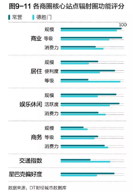 6号线上的常营站辐射圈是个商业氛围浓厚的商圈,其商业规模和商业等级指数分别高达97、98,在7个商圈中位列第1。(如图9-11)除此之外,休闲娱乐规模和活跃度均为7个商圈中的第二名,仅次于国贸站,是一个发展成熟的购物休闲居住区。常营商圈内商业发展成熟,娱乐项目丰富,且带有一点文艺气息,星巴克偏好度高,咖啡厅、甜品店、DIY手工坊较多,最知名的便是长楹天街。