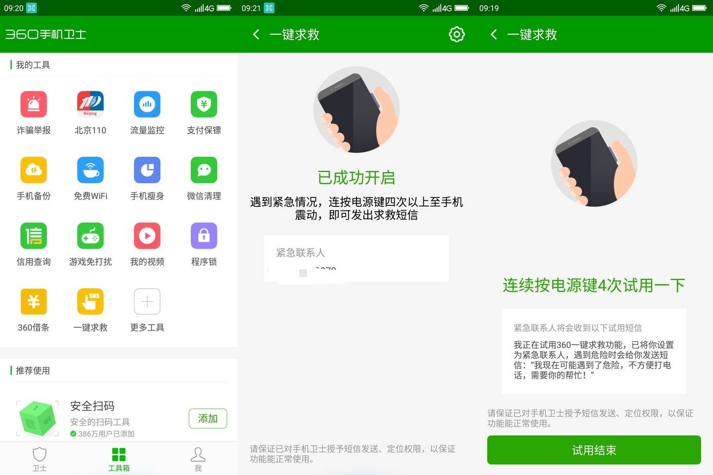 在 360 手机内置的“安全中心”中,打开工具箱就能添加“一键求救”功能,用户可以设置最多三个号码。当遇到紧急情况时,连续按下四次电源键,手机震动后表明默认求救短信发送成功,短信内会附带当前实时位置,便于查找。