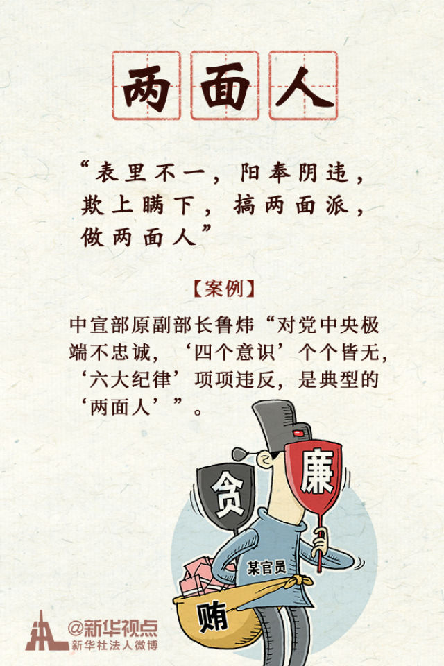 【案例】党的十九大闭幕不到一个月,中宣部原副部长鲁炜严重违纪被立案审查,成为十九大后落马首虎。此后公布的通报用词严厉:鲁炜身为党的高级干部,理想信念缺失,毫无党性原则,对党中央极端不忠诚,“四个意识”个个皆无,“六大纪律”项项违反,是典型的“两面人”。