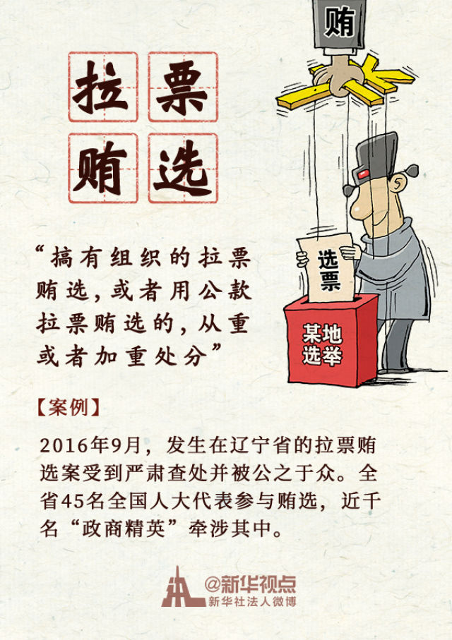 【点评】党的十八大以来,中央先后查处湖南衡阳破坏选举案、四川南充拉票贿选案、辽宁拉票贿选案等一系列大案,体现了猛药去疴、重典治乱的决心意志。新条例对拉票贿选从重加重处分,正是这种决心意志的体现。