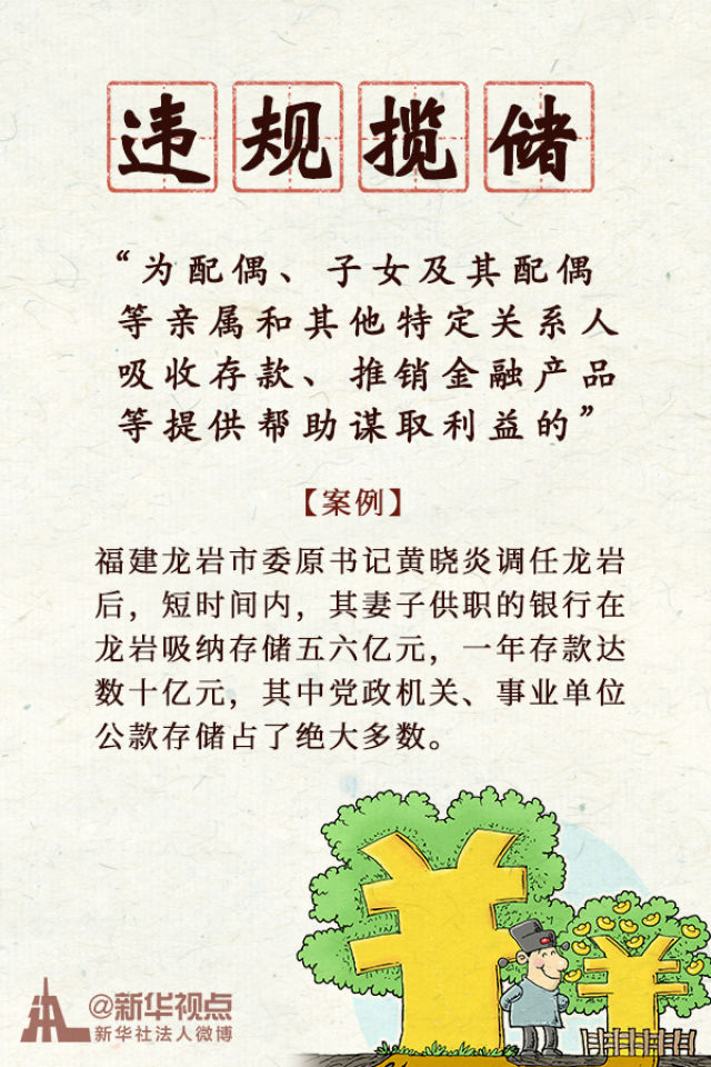 【负面清单】“利用职权或者职务上的影响,为配偶、子女及其配偶等亲属和其他特定关系人吸收存款、推销金融产品等提供帮助谋取利益的”