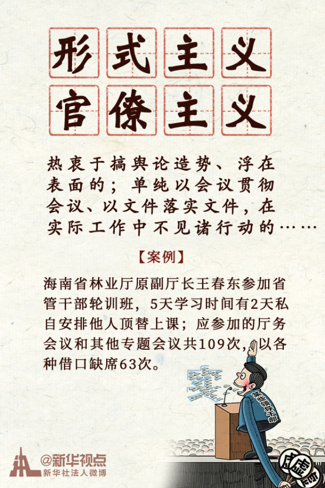 【案例】 参加省管干部轮训班,5天学习时间有2天私自安排他人顶替上课;应参加的厅务会议和其他专题会议共109次,以各种借口缺席63次……海南省林业厅原副厅长王春东,因形式主义、官僚主义问题被公开通报。