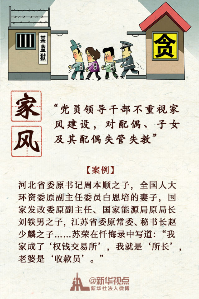 【案例】河北省委原书记周本顺之子,全国人大环资委原副主任委员白恩培的妻子,国家发改委原副主任、国家能源局原局长刘铁男之子,江苏省委原常委、秘书长赵少麟之子……一个个腐败领域的“夫妻档”“父子兵”“全家腐”,透视出家风的重要性。苏荣在忏悔录中写道:“我家成了‘权钱交易所’,我就是‘所长’,老婆是‘收款员’。”