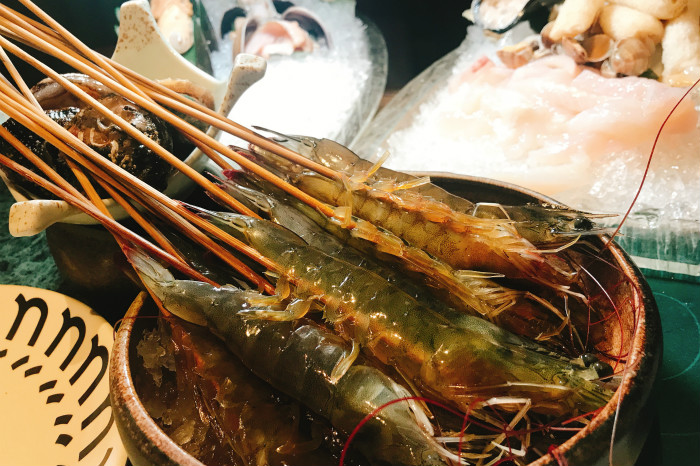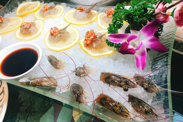 除了对汤底的迷恋,这里的主角当然还是海鲜了。澳洲空运来的小青龙成为了名副其实的青龙虾头盘;来自泰国的大虎虾当场加工,摆上桌时小爪子还在动;还有不可错过的用柠檬片打底的鲜虾刺身,淋上小米辣与蒜蓉的酱料,尝尝海鲜变辣的味道。