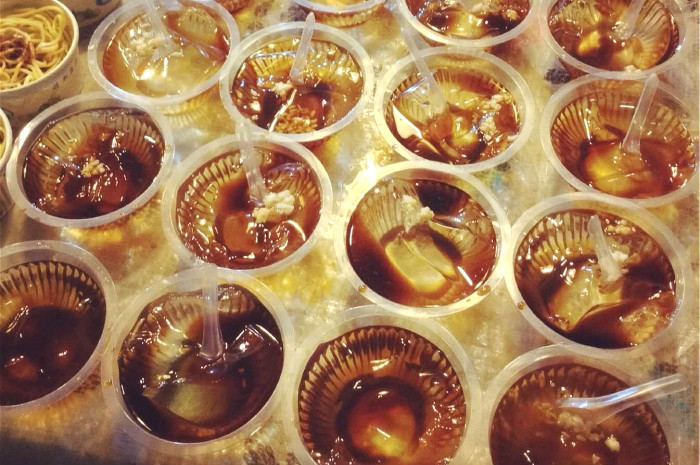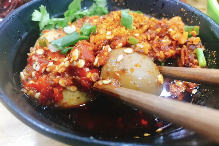 除了串起来的肉菜,这里还有用小碗装起来的各类火锅粉、卤鹌鹑蛋、冒千层肚、脑花、兔腰、兔肚和兔头,目之所及全是红红的辣椒面。