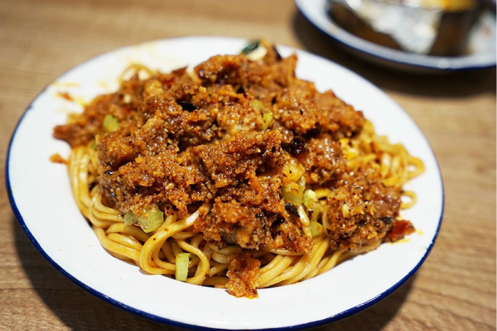 其实不然,火的自然还是面,只不过全称应该是粉蒸牛肉干拌面,其实就是将粉蒸牛肉用作干拌面的绍子了。这碗面并不是成都的特色类型,反而颇有宜宾燃面的气质。但每片牛肉都是肥瘦相间,被粉末包裹着,料下的重,成都人自然得排起队来。