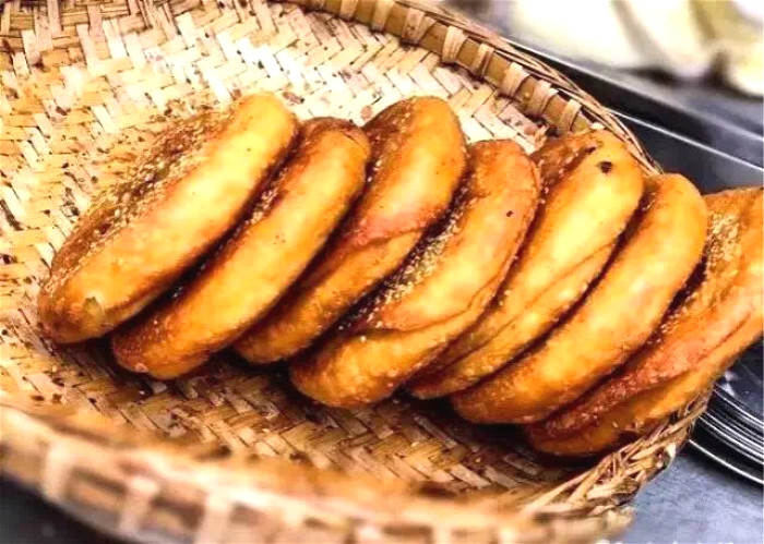 厚厚的面饼压好后就放入油盘里炸,炸完后再放入炉中烤干。酥脆的皮里包着花椒和牛肉末,吃起来辣呼呼的。这里除了有牛肉锅魁和鲜肉锅魁外,红糖锅魁也很不错。一人份的量吃着挺撑,每到中午和下午,来这里排队买锅魁的人络绎不绝。