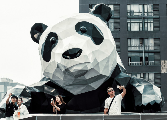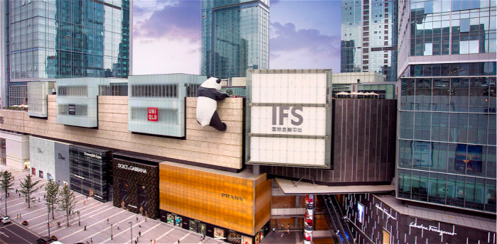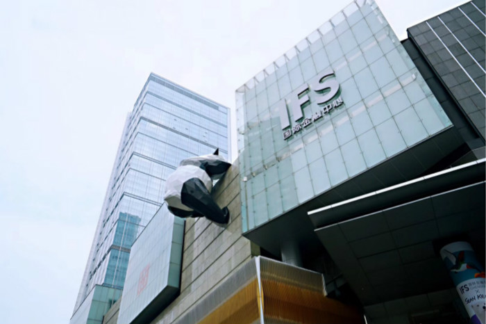 来到IFS,就会被一只巨大的熊猫胖胖吸引,从楼下看它,只能看见圆滚滚的大屁股,调皮的它趴在IFS的顶楼,像是想翻越到楼顶平台上。