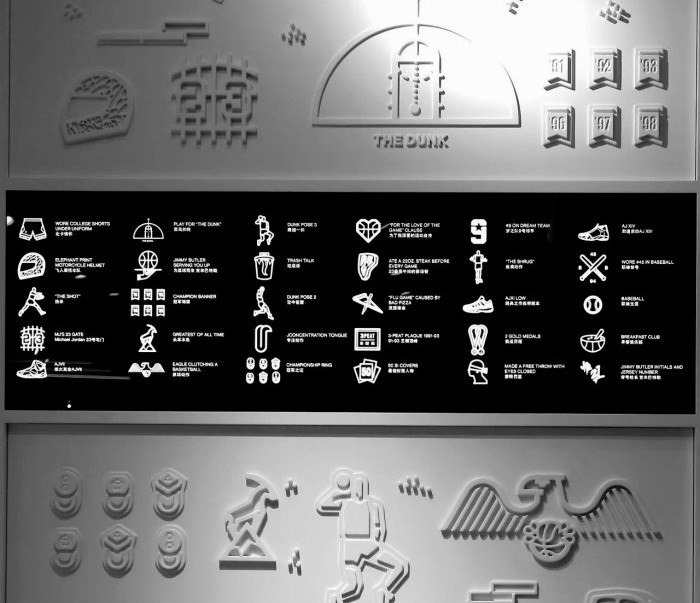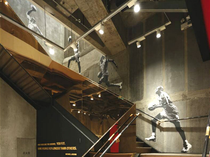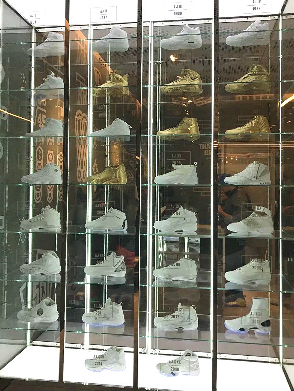 在二楼的收银台旁,还有Air Jordan1-30代的战靴展示柜,就像楼梯上乔丹经典的扣篮动作剪影一般,让人们细细回顾着这个传奇人物。