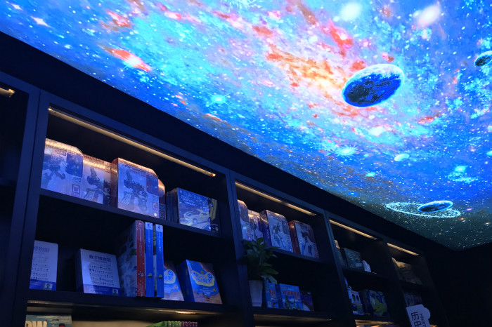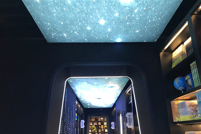 店里整体的装修风格给人一种未来星球的科技感。几何线条的勾勒、太空舱与星球图案的搭配,绿色森林的展现,都像是在体验一座未来的书库一般。