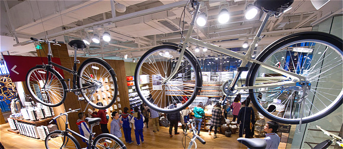 3层透明的玻璃窗和地下1层,用屏风和墙面区隔开来了3141平方米的空间,特别为中国设计的黑白两款自行车展示,以及营造出符合MUJI感的美学氛围,都让这家店成为了不可错过的选择。