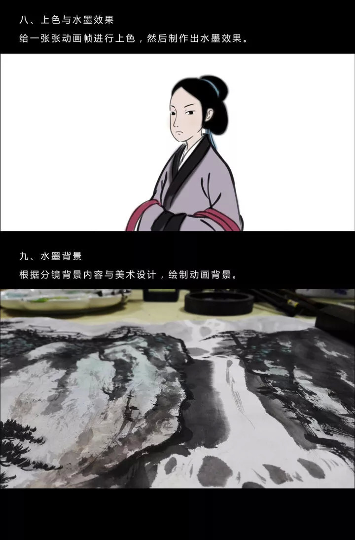 水墨动画制作核心技术在摄影部分的合成。动画里的角色是先由铅笔画出来,然后描到透明胶纸上,上色,再由摄影机拍摄出来的,制作手法非常复杂。