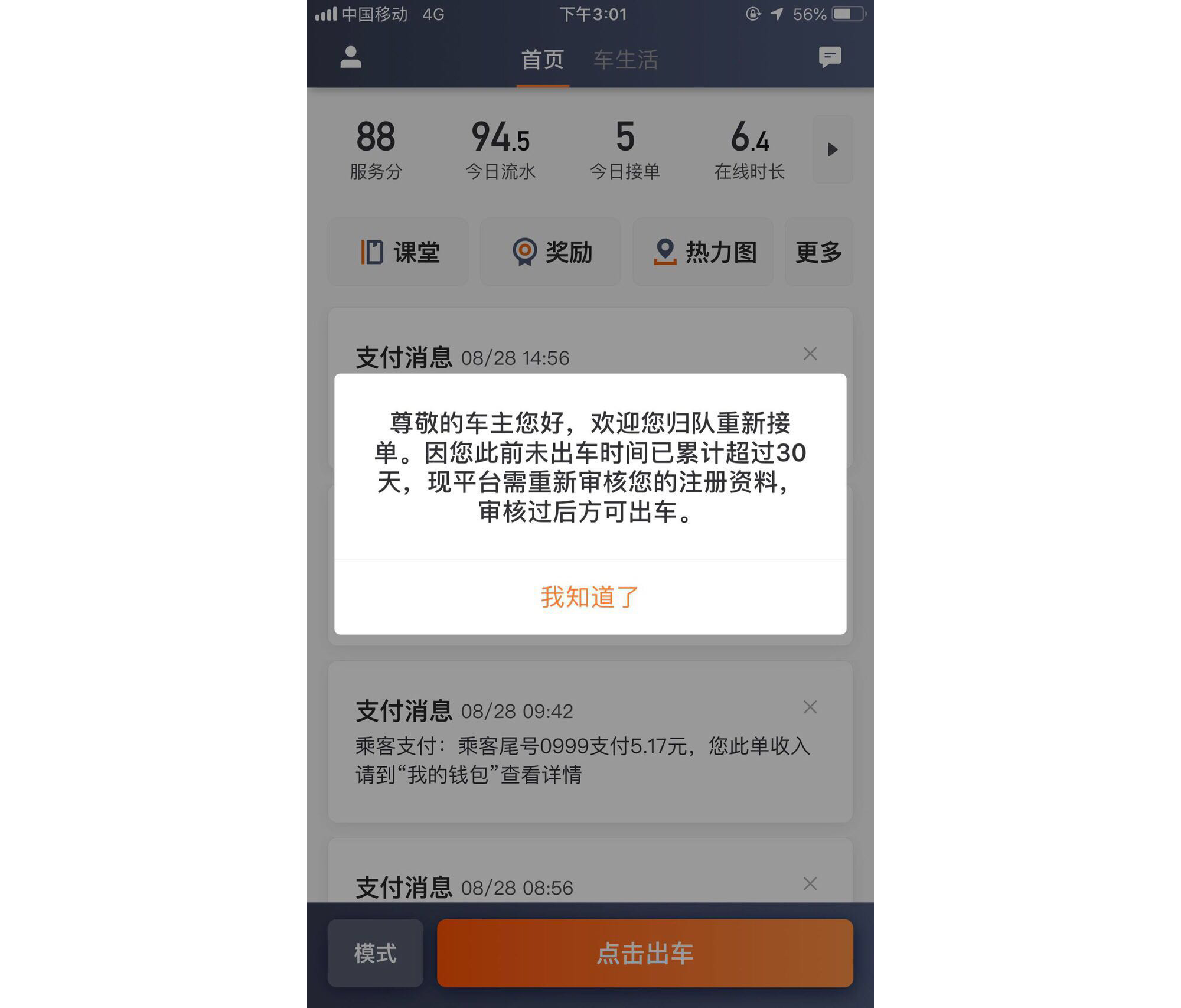 滴滴车主客户端显示,“尊敬的车主您好,欢迎您归队重新接单,因您此前未出车时间已累计超过30天,现平台需要重新审核您的注册资料,审核过后方可出车。”