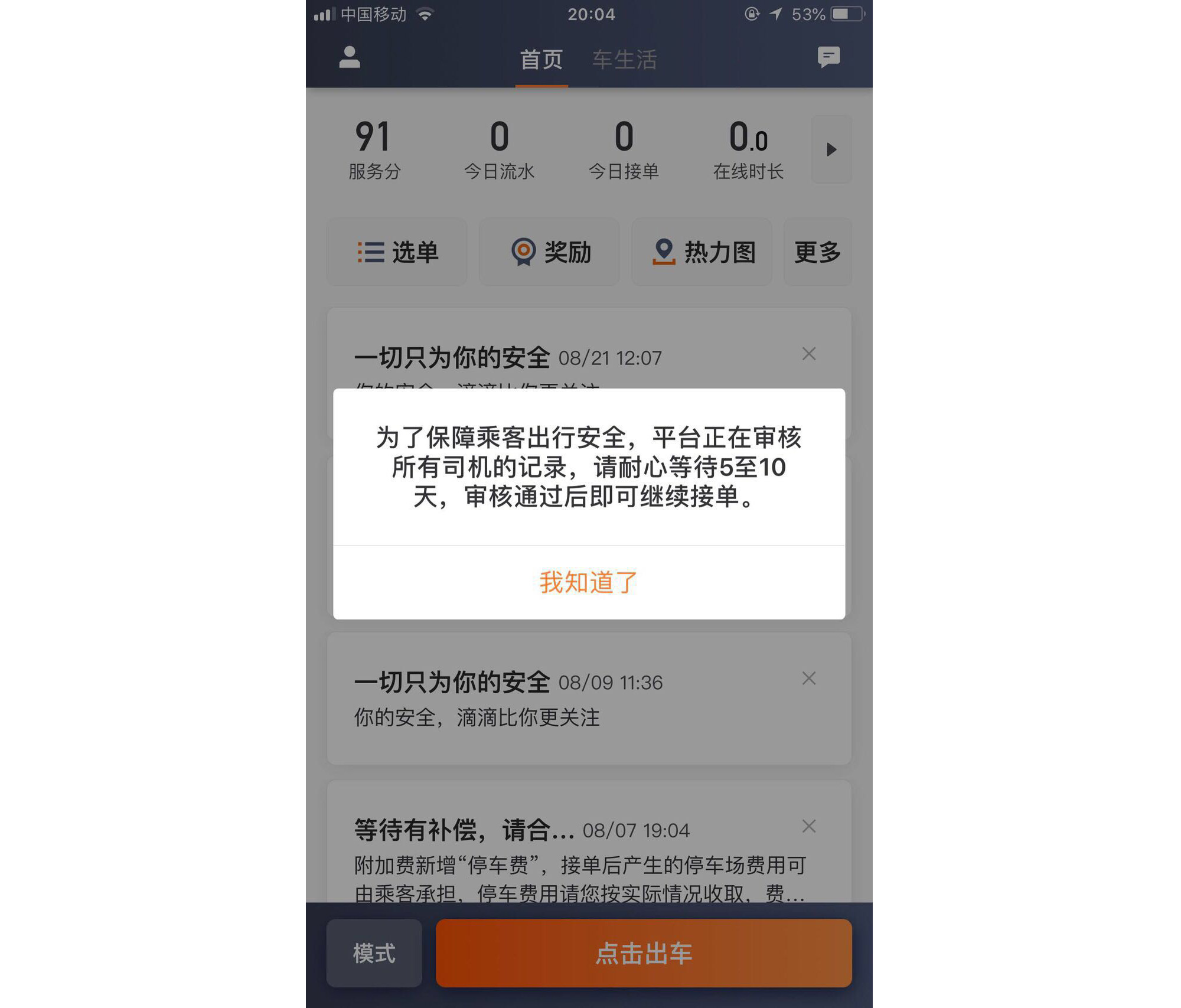 该司机客户端显示,“为了保障乘客出行安全,平台正在审核所有司机的记录,请耐心等待5至10天,审核通过后即可继续接单。”