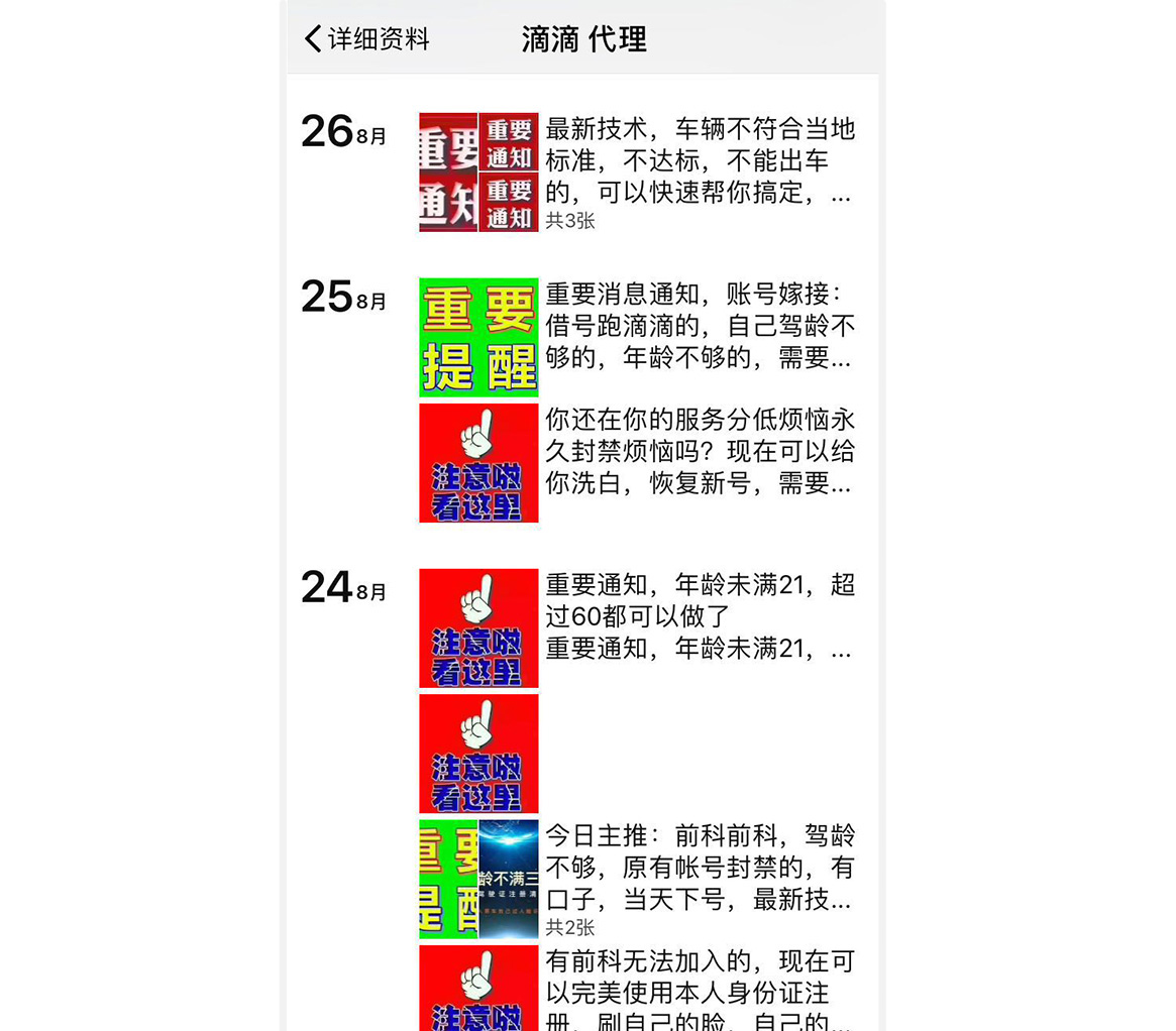 记者以司机身份加上了一位代理的微信,其朋友圈发布的均是规避各种不合规条件的注册广告。