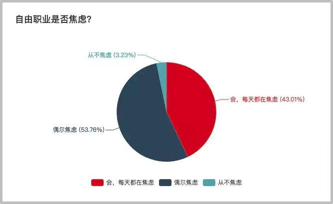 在“自由职业是否焦虑”这个问题中,43%的人选择了每天都在焦虑,53%的选择了偶尔焦虑,只有3%的人从不焦虑。