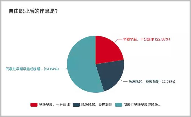 几乎一半以上的人自由职业以后开始间歇性早睡早起和晚睡晚起,只有22%的人能做到早睡早起,作息规律。