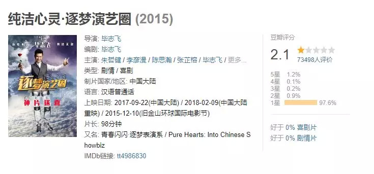 2017年9月在内地上映时,《逐梦演艺圈》遭到了观众清一色的吐槽,超过7万名网友在豆瓣上给电影打分,如今评分落在2.1分,依然牢牢占据豆瓣全网最差的排行榜首。粗略翻一翻网友的评论,控诉式的批评触目惊心: