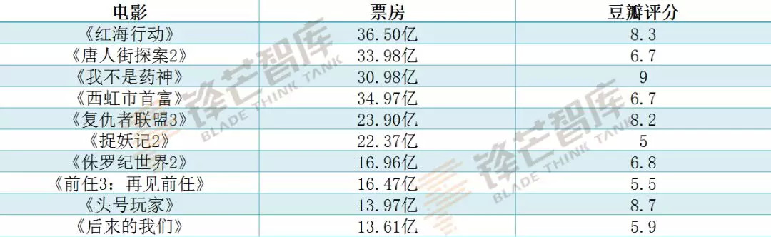 以下列出2018年票房排名TOP10的电影,对比其市场表现与豆瓣评分: