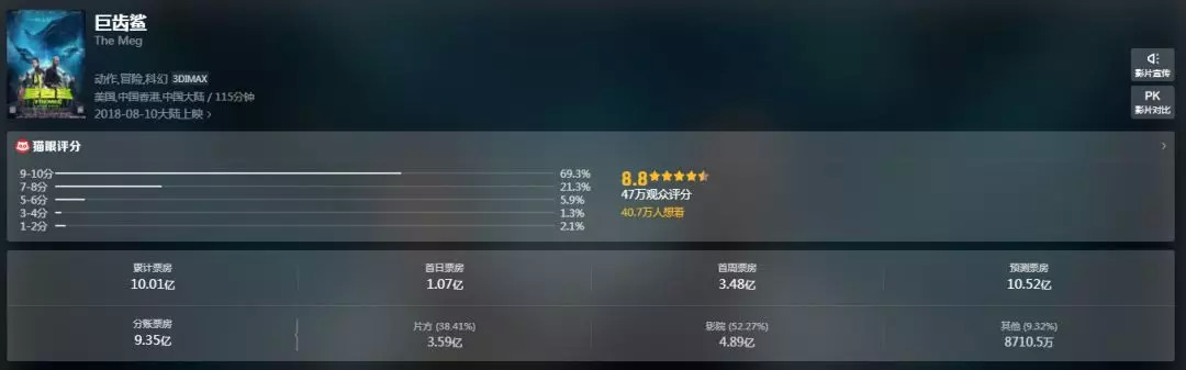 正因为用户群体的截然不同,其口味也可谓千差万别。如中美合拍片《巨齿鲨》只是一部稀松平常的中美合拍电影,在豆瓣上的6.0评分,显示出文艺青年对B级惊悚片的审慎认可;而在猫眼上,囊括了所有购票群体的观众则给出了8.8的高分,甚至超过了《一出好戏》的8.2分。