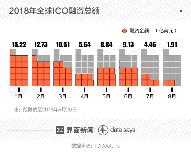 但放眼全球,2018年全球ICO融资总额大幅缩减,2018年8月份(截至26日)的融资总额仅为1.91亿美元,而1月份的融资总额是8月份的近八倍。