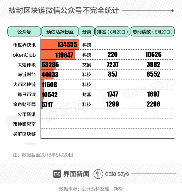 腾讯方面表示,部分公众号涉嫌发布ICO和虚拟货币交易炒作信息,违反《即时通讯工具公众信息服务发展管理暂行规定》,屏蔽其所有内容并且永久封停。据界面数据(公众号ID:tuli_shuju)不完全统计,此次被封停账号中,币世界快讯、TokenClub的预估活跃粉丝数较高,在10万以上。