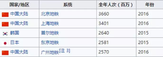 维基百科给出的世界各地全年地铁客运量排名