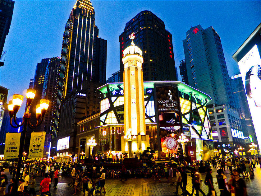 因为十几年前,重庆的版图远不如现在开阔。当时,只有渝中半岛的解放碑附近才被当地人视为重庆城。依托中华民族抗战胜利纪念碑的旅游资源优势,解放碑区域在1950年就诞生了重庆首家国营百货商店,并且集中了重庆最大的农贸市场:大阳沟菜市场;最大的书城:重庆新华书店以及被称为“好吃街”的八一路小吃街等配套产业链。