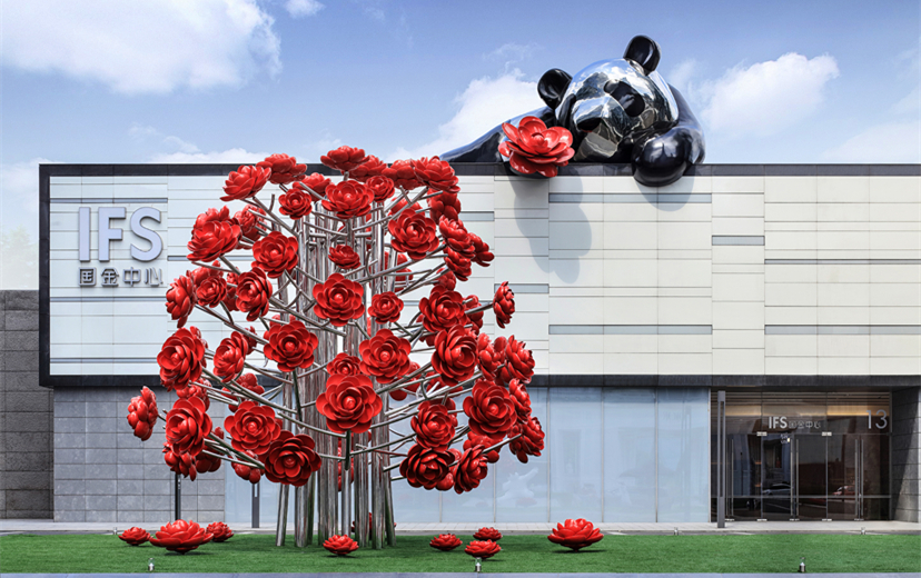 有意思的是,与IFS同时来到重庆的还有一只反光不锈钢材质的,趴在楼顶上,一边拿着山茶花一边微微探出头望着地面上的山茶花树的“大熊猫”。作为IFS项目的坐标式艺术装置,重庆IFS将重庆的市花山茶与代表中国的大熊猫相结合,并去为其取名为“LOVE.FOUND.”,由意大利艺术家创作的“LOVE.FOUND.”设计,希望它能为重庆的公众和游客提供一个新的“打卡”项目。