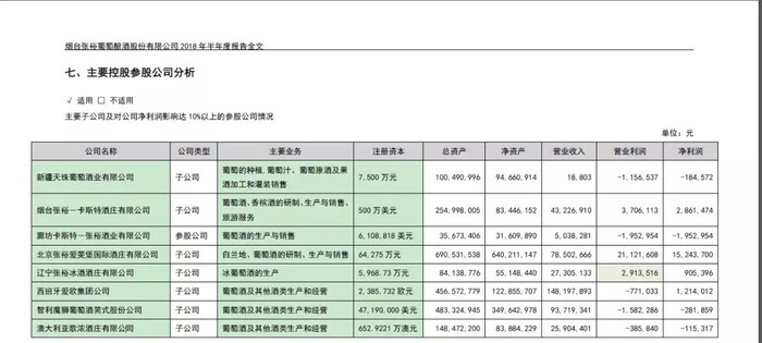 数据显示,2018年上半年,张裕旗下新疆天珠葡萄酒业有限公司、廊坊卡斯特-张裕酒业有限公司、西班牙爱欧集团公司、智利魔狮葡萄酒简式股份公司和澳大利亚歌浓酒庄有限公司的营业利润都为负数,处于亏损之中,而后三家公司“清一色”都是张裕的海外子公司!
