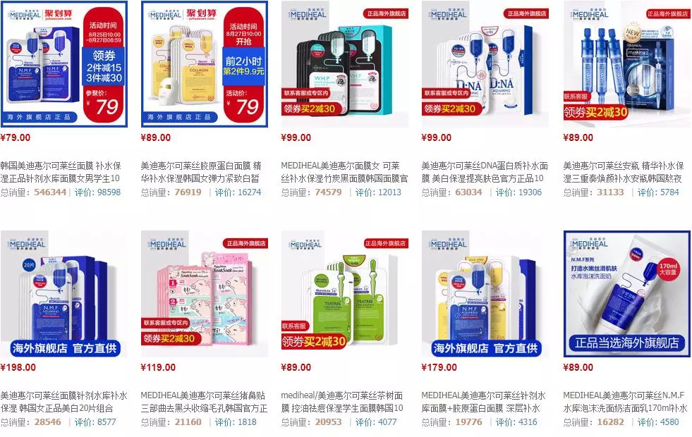 显而易见,补水在中国面膜市场的消费需求长期且仍然处于第一位,而美迪惠尔与消费者的“默契”在此基础上也有了用武之地。在中国市场,以其品牌官方天猫海外旗舰店为例,经典的水库针剂面膜以54.6万次销售遥遥领先,是排名第二的胶原蛋白精华面膜总销量的8倍,也是店内所有在售产品中唯一一个过10万销量的产品。而在11款销量超过1万的产品中,大都又以补水功效的为主。