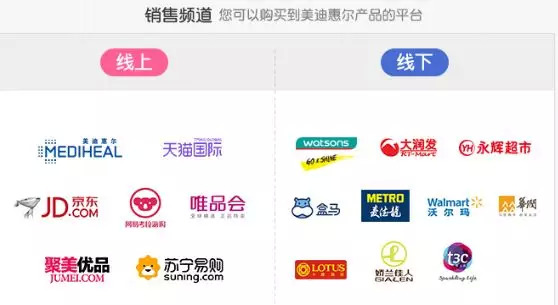 目前,美迪惠尔在中国的销售渠道已深入线上线下,据其官网显示,线上除了美迪惠尔官方网站以及官方商城外,美迪惠尔还在各大电商平台开通了官方旗舰店,包括天猫、京东、云集微店等,并与聚美优品、网易考拉、唯品会、苏宁易购等达成合作;线下则全面入驻屈臣氏、家乐福、大润发、永辉超市、盒马鲜生、麦德龙、沃尔玛、华润、卜蜂莲花、娇兰佳人、唐三彩等。