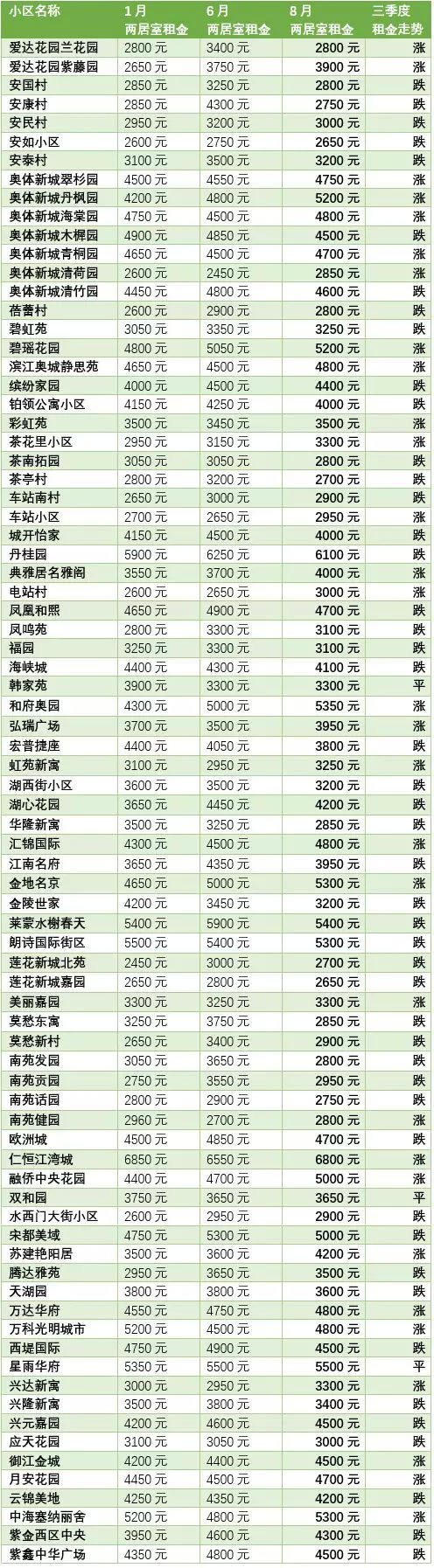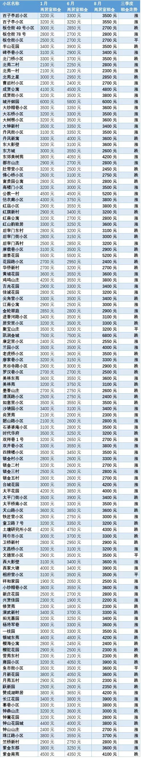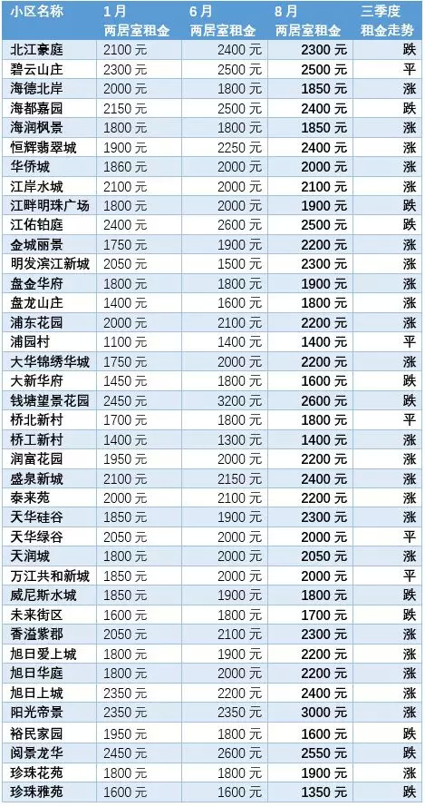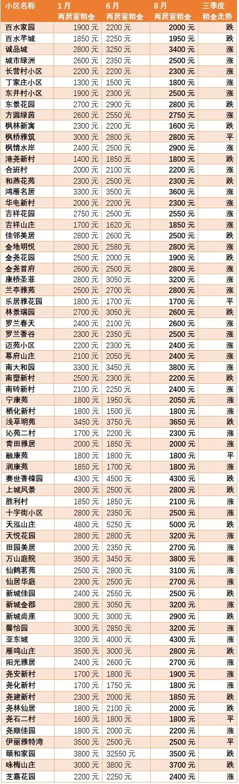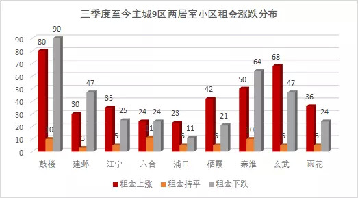 三季度至今80个两居室小区租金报价30涨3平47跌