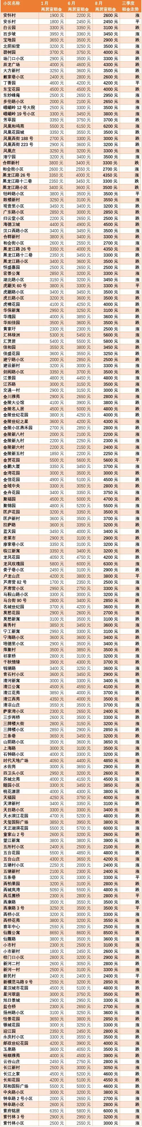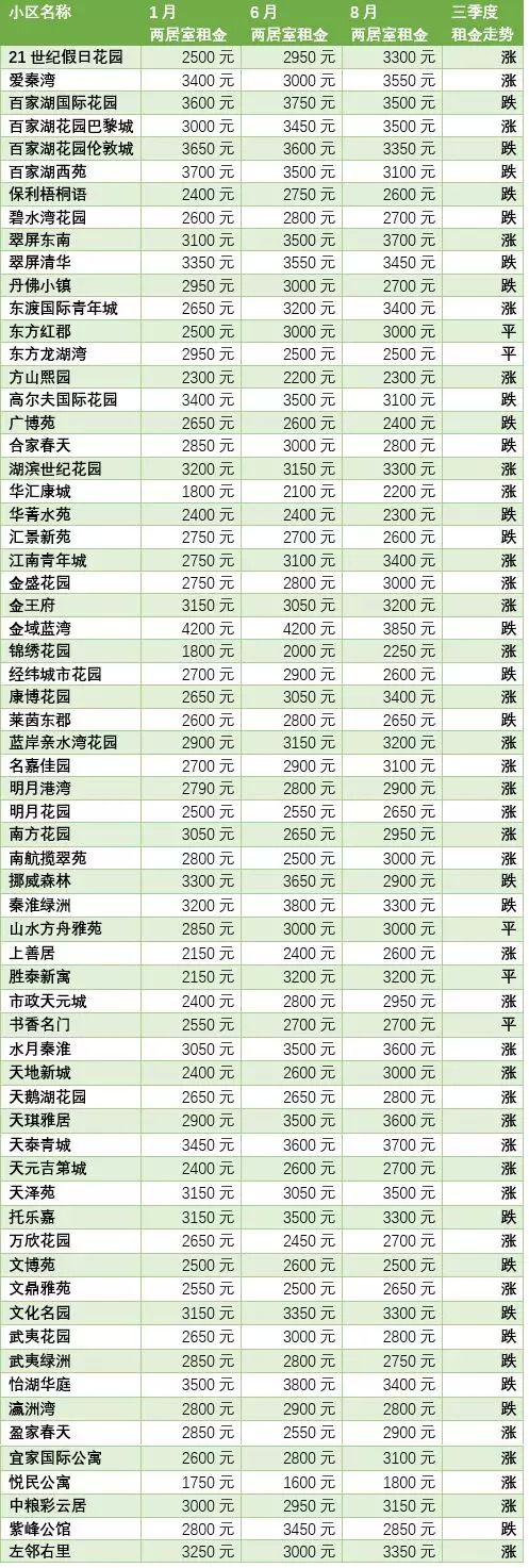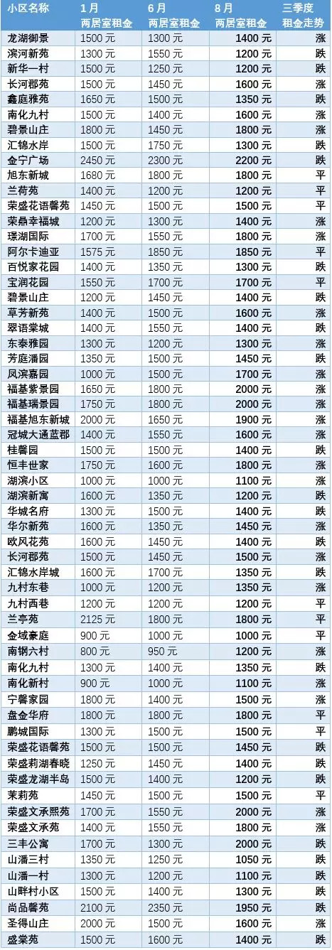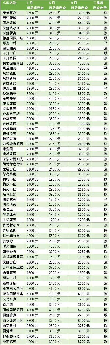 三季度至今80个两居室小区租金报价30涨3平47跌