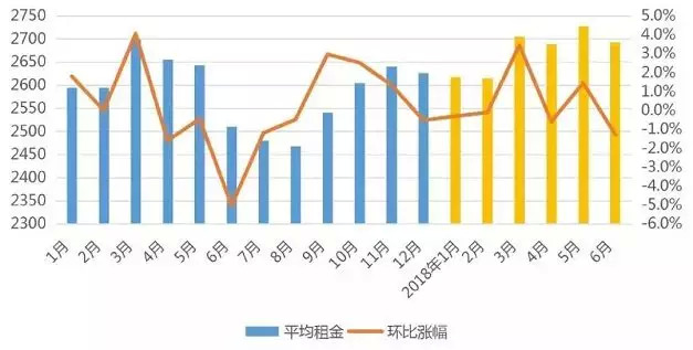 来自南京贝壳研究院的统计数据也显示,南京市租金水平相对平稳,2018年以来同比2017年整体还略有下滑。按照每平方米租金计算,2017年每月每平方米租金在50元左右,而2018年7月还不到40元。近3年的租金最高点在2015年12月,当月的每平方米租金几乎接近80元,不过大多数月份都在30元-50元这个区间波动。365租房对全市个人出租房源的报价统计数据也显示,2018年7月个人出租房源平均报价为2845元/月,与6月的2744元/月相比,上涨了101元/月,涨幅为3.67%。但与去年7月3122元/月的平均报价相比,反而下降了8%左右。