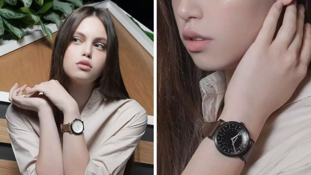 正面看这款手表,只是比较简约,比较时尚而已,如果侧面来看才会发现它的特别:这款Contempus Watch的表盘,数字标记和指针全都是弯的。