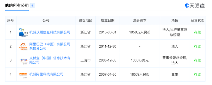 而叶郁青除了担任支付宝(中国)信息技术有限公司法人、董事长兼总经理外,还身兼杭州阿里科技有限公司董事、阿里巴巴余杭分公司法人等职务。
