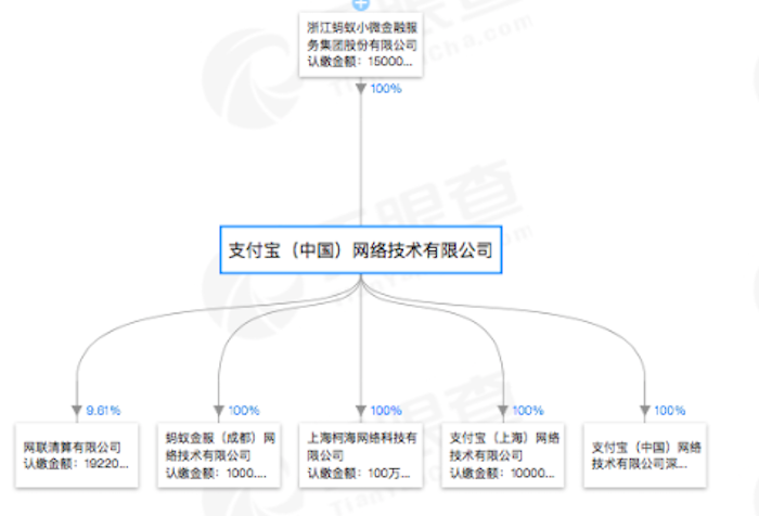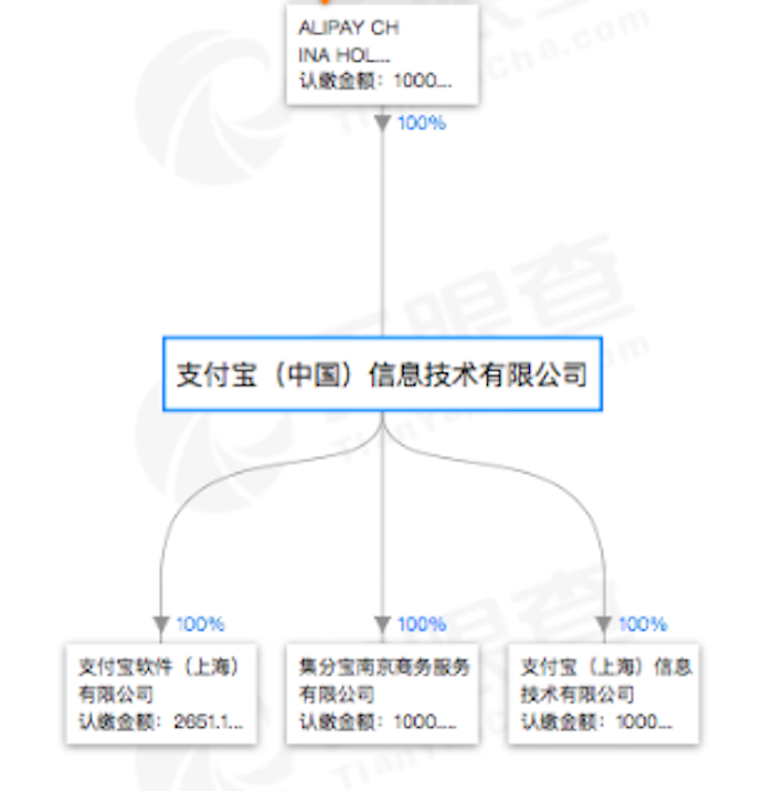 天眼查信息显示,目前支付宝(中国)信息技术有限公司旗下有三家控股公司,分别为支付宝(上海)信息技术有限公司、支付宝软件(上海)有限公司和集分宝南京商务服务有限公司。