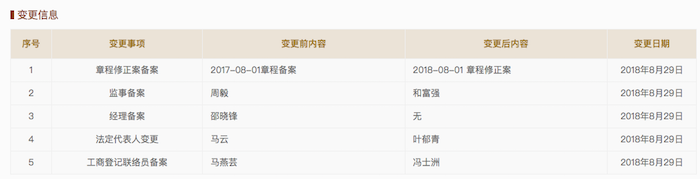 公司唯一股东为ALIPAY CHINA HOLDING LIMITED,其法定代表人的确在2018年8月29日由马云变更为了叶郁青。此外,公司监事、董事、经理、工商登记联络员也在同一天进行了变更。