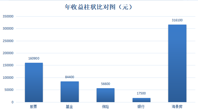 我们以投入100万本金为例,对股票、基金、保险、银行储蓄以及选购一套100㎡海景房,一年后所得利润高低来进行对比,便可以明显看出他们之间的收益差距。