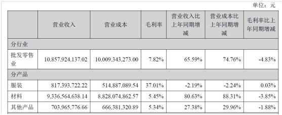 尽管服装品类的毛利率较高,但是这块业务处于收缩状态,报告期内品牌服饰业务营业收入与上年同比下降2.19%。