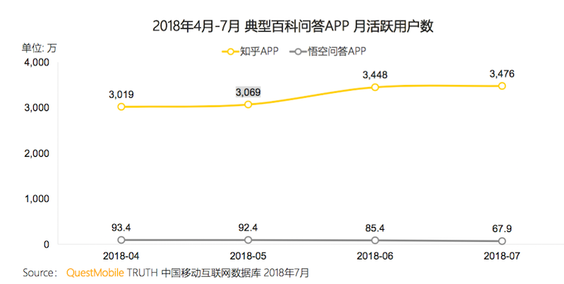 据第三方数据平台QuestMobile 提供的数据来看,2018年4月到7月,知乎的MAU(月活跃用户)数平均在3200万左右,而悟空问答平均在80万左右;从6月到7月,悟空问答的活跃用户活跃用户更陡然下降17万。
