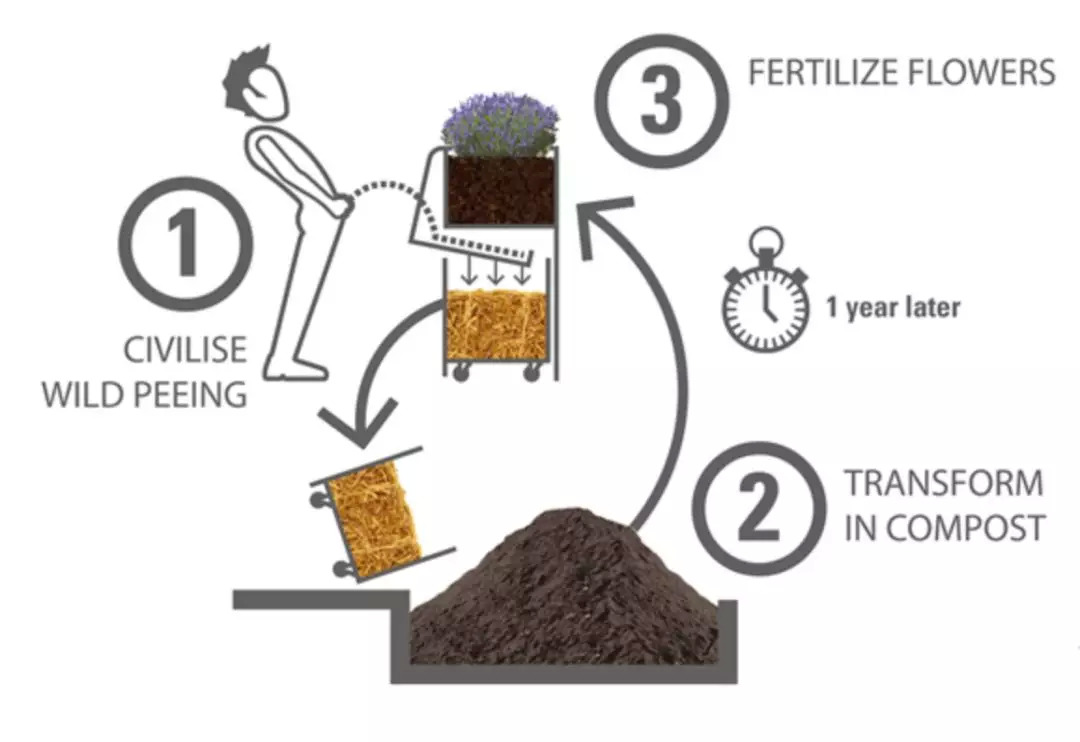 不过你还别说,Uritrottoir这东西的原理倒是非常环保,红色部分是小便池,底下的箱子装满了秸秆及木屑。三种大小可选,最大可以使用600次,容积240L,最小的也能使用275次,容积110L。